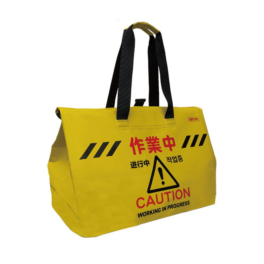 「清掃中」「作業中」の表示を備え、単なるバッグとしてだけでなく注意喚起のサインとしても機能。濡れたモップや雑巾をそのまま収納できるため、作業後の持ち運びもスムーズです。耐水圧50,000mm以上のPVC加工により、サッと拭くだけでお手入れが完了し、丸洗いも可能。衛生管理と効率性を同時に高める、現場で頼れるアイテムです。